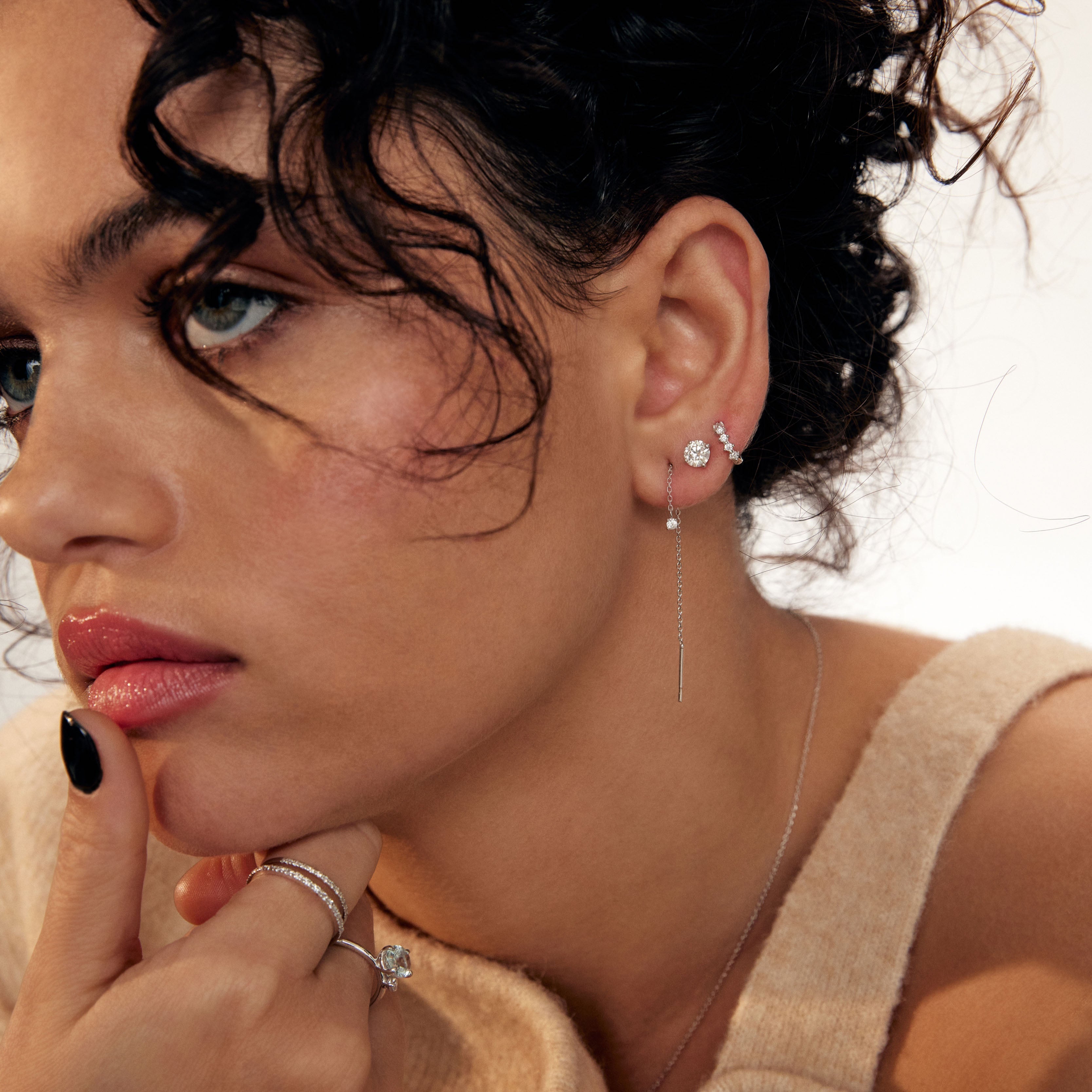 These Petite 2mm stone thread earrings can be made in either Clear white Cubic Zirconia (synthetic) Natural Diamond or Natural Cognac Diamond (Light brown) as a stone option. It's set with 2mm round brilliant cut stone with 4 prongs setting.