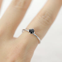 About 5 mm in diameter a round cut natural stone sits upon 4 classic prongs set well balanced on 1.3 mm round band.
