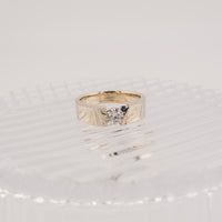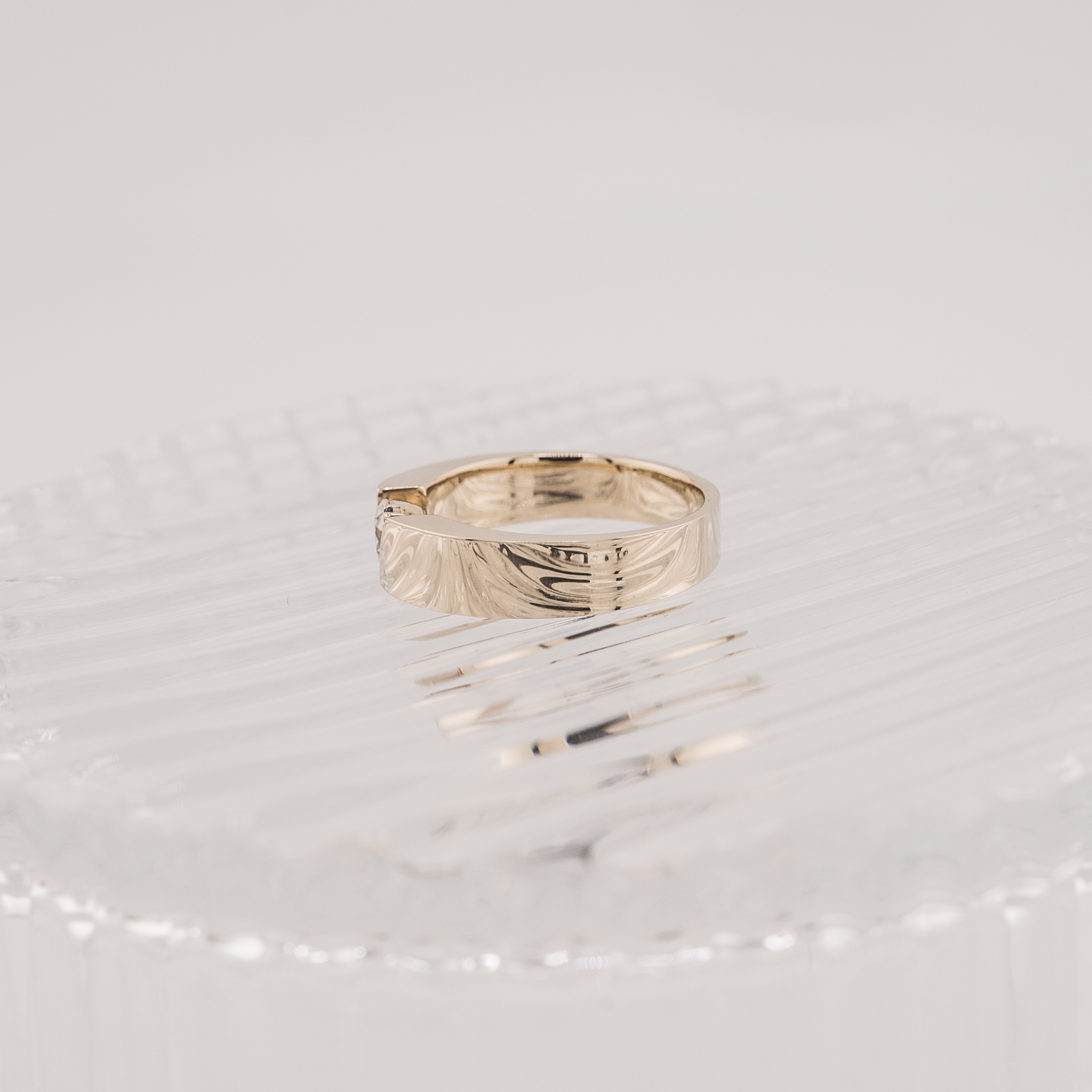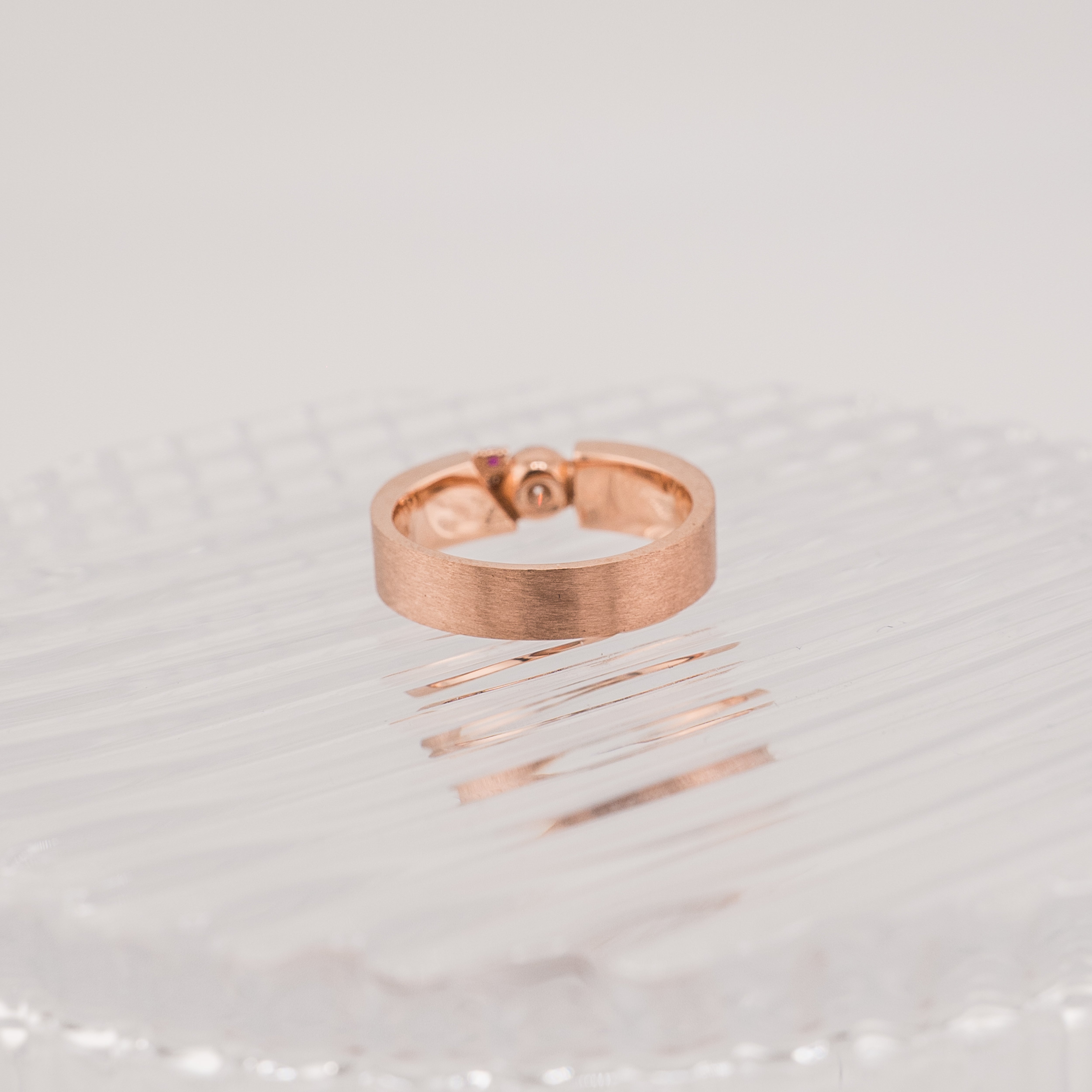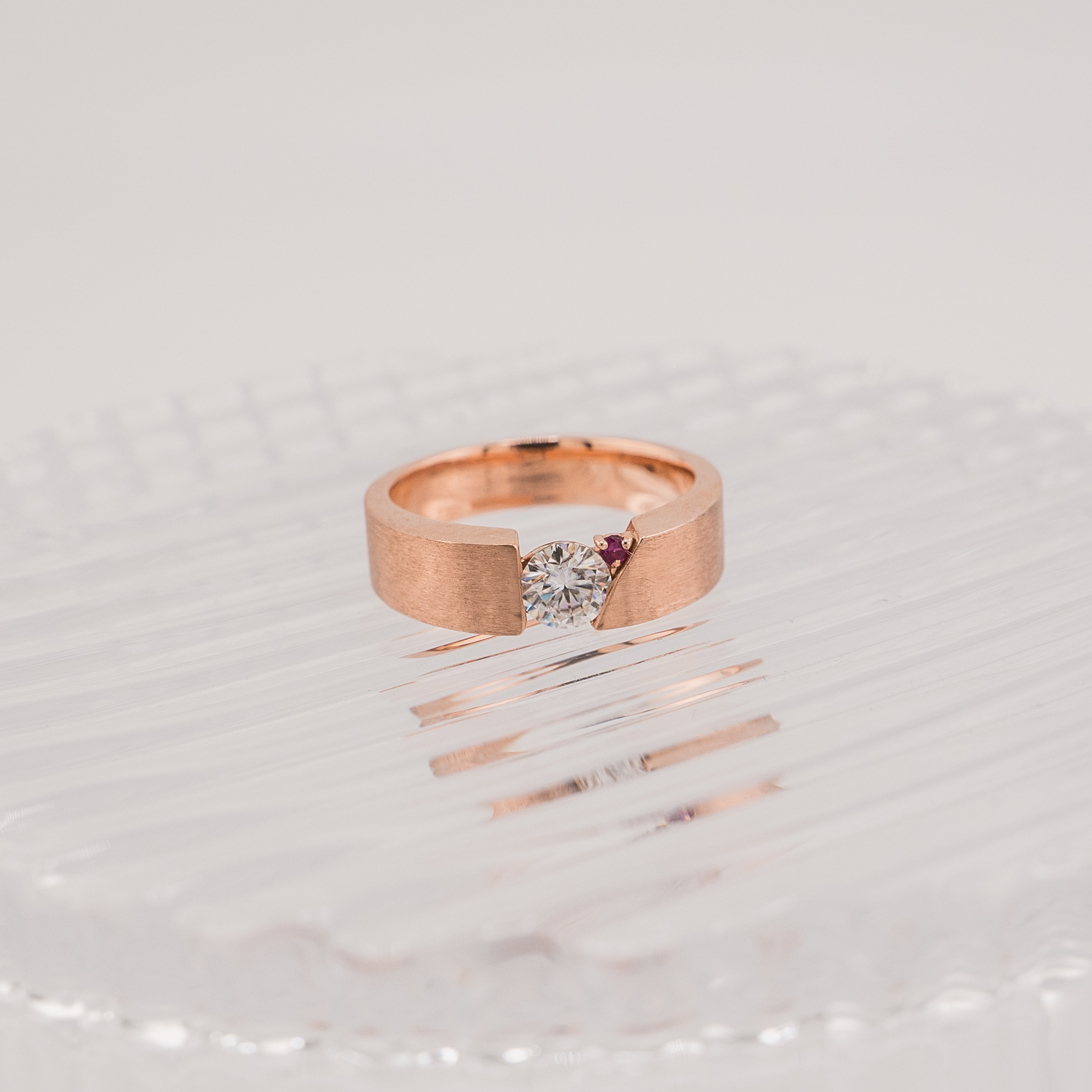 A true statement ring, the Solaris tension ring shines with elegance in this bold, modern design, that features a round cut stone that appears to be floating in a 5mm solid gold band with a small precious stone to complement.