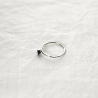 About 5 mm in diameter a round cut natural stone sits upon 4 classic prongs set well balanced on 1.3 mm round band.